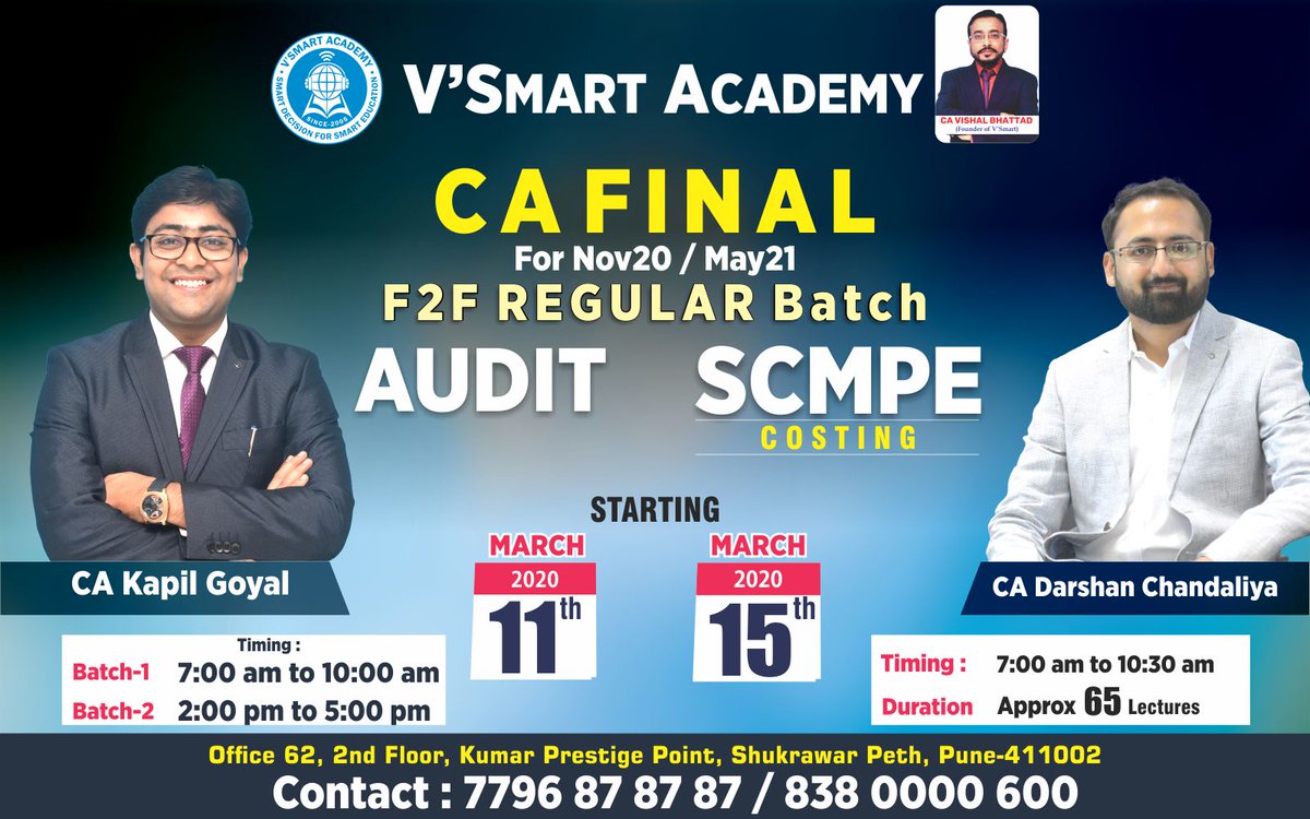 Office 62 2nd floor kumar prestige point bajirao rd shukrawar peth pune 411 002 91 8888388886 email protected. V smart academy is founded by idt guru ca vishal bhattad sir in 2005 since then we are working on our vision of innovative and quality education in ca cs and cma studies. I am a client of vsmart solutions from last 3 years. Ca final audit super 25 fast track video lectures by ca kapil goyal download ca final audit super 25 full course fast track blended batch of existing new lectures amended updated for may 2020 exam nov 2020 exam onward attempt.